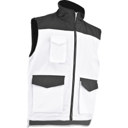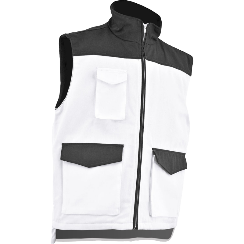 GILET MULTIPOCHES Tissu extérieur:65% coton renforcé de 35% polyester. Tissu intérieur: polaire(310g/m²). 2 doubles poches plaquées avec rabat. 1 poche téléphone sur poitrine avec rabat. Dos rallongé avec pattes de serrage réglables. Fermé par glissière. Très résistant et chaud. Existe aussi en gris/anthracite.